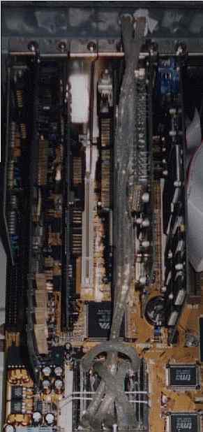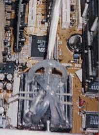 Der Rest war die warscheinlich schwerste Arbeit. - Das Aufspannen auf den Prozessor. Nach etlichen Versuchen sass; der absichtlich klein gewählte Gummie endlich auf dem Zielobjekt. |